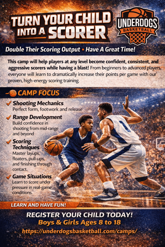 By the end of camp, players will not only be better shooters — they’ll understand how to get buckets, create scoring opportunities, and play with confidence.